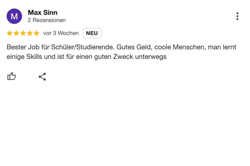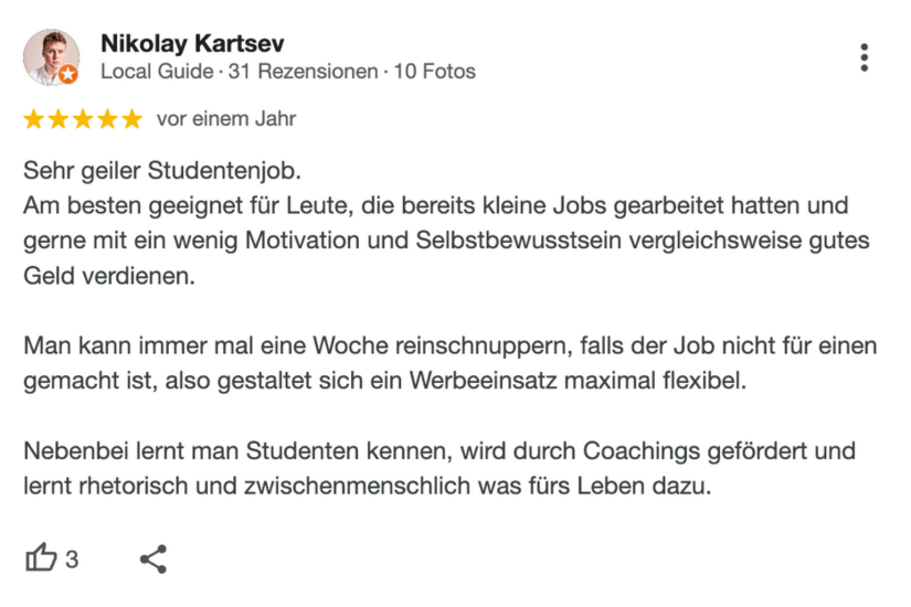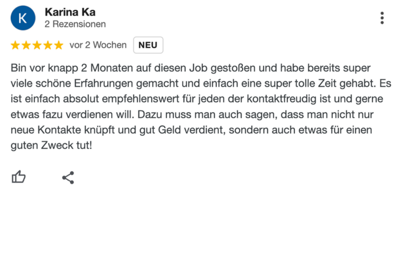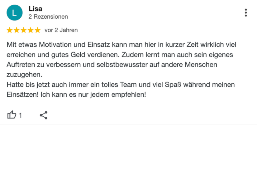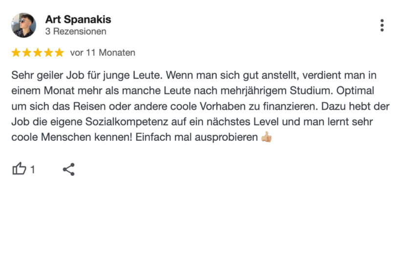 Richtig ist, dass Du bei uns nach Leistung bezahlt wirst. Uns ist aber wichtig, dass Du die bestmöglichen Erfahrungen mit uns machst und in jedem Fall mit einem Mehrwert nach Hause gehst. Das jemand aber ganz ohne Entlohung nach Hause gehen muss, kommt praktisch nicht vor. Denn Du verbringst die ersten Tage zusammen mit einem erfahrenen Teamleiter. So kannst Du Dir sicher sein, dass Du nicht umsonst arbeitest.